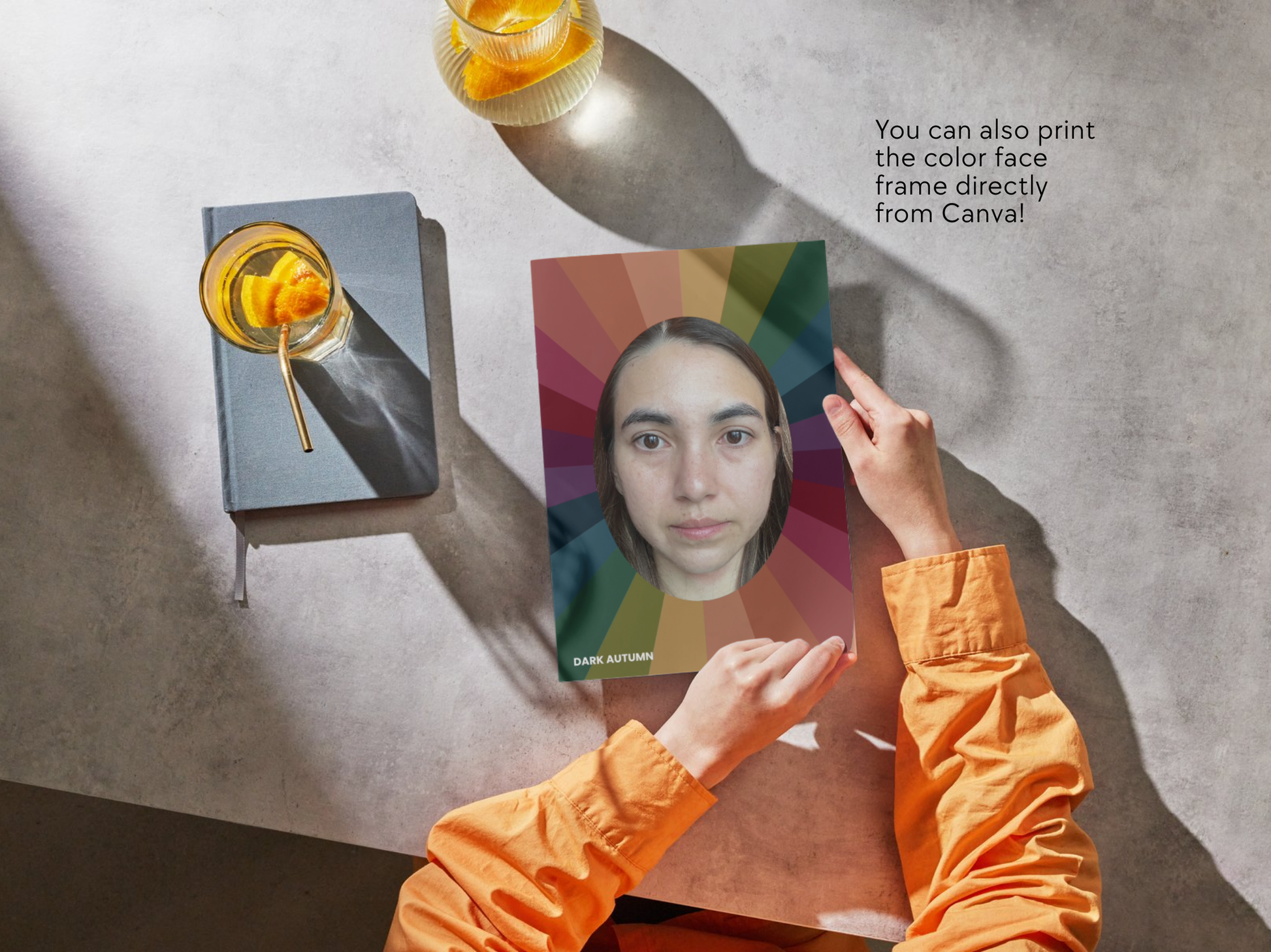 1. Print-ready 12 Seasonal Color Face Frames in PNGs & PDFs in 3 different sizes (US Letter, A4 and A3) for in-person analysis. Simply print and cut out the white oval to create a physical color draping tool!