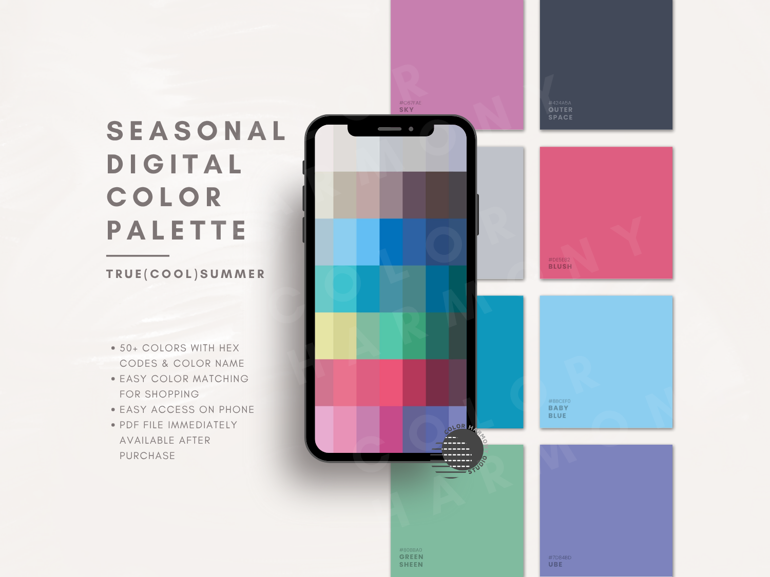 This digital product features a beautifully curated color palette for the “True Cool Summer” season, showcasing over 50 stunning colors with corresponding HEX codes and color names. Perfect for effortless color matching, this palette is ideal for enhancing your shopping experience and making confident style choices!